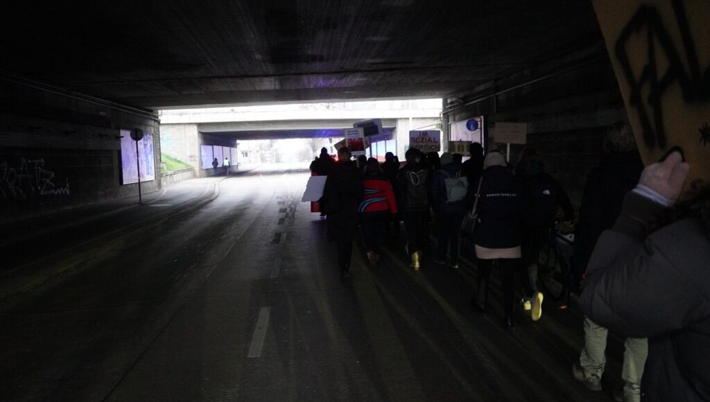 Nach den Abstimmungen und Bastelaktionen beginnen wir unsere Demonstration, über die Kerschensteinergasse – Längenfeldgasse – VHS Längenfeldgasse und sind mittlerweile wieder mehr geworden. ca. 54 Persoen aus dem ASB-WSD.